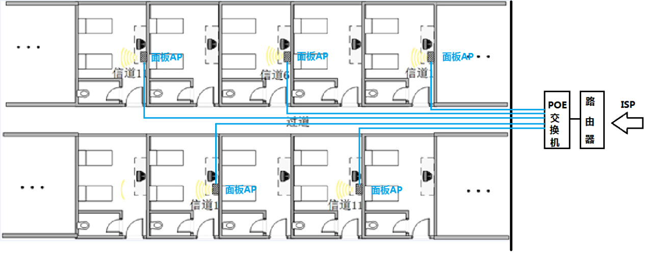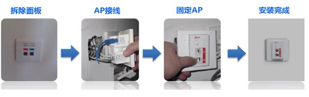 采用86面板式无线AP,在客房内安装无线AP,在弱电管井加装POE供电交换机,通过酒店客房原有网线对AP进行供电及网络信号传输,以达到无线网络覆盖。覆盖效果好、充分利用现有资源、安装简便、不破坏原有布局。仅需要将墙面有线接口面板更换为面板型AP即可。安装时间短,不影响正常运营。